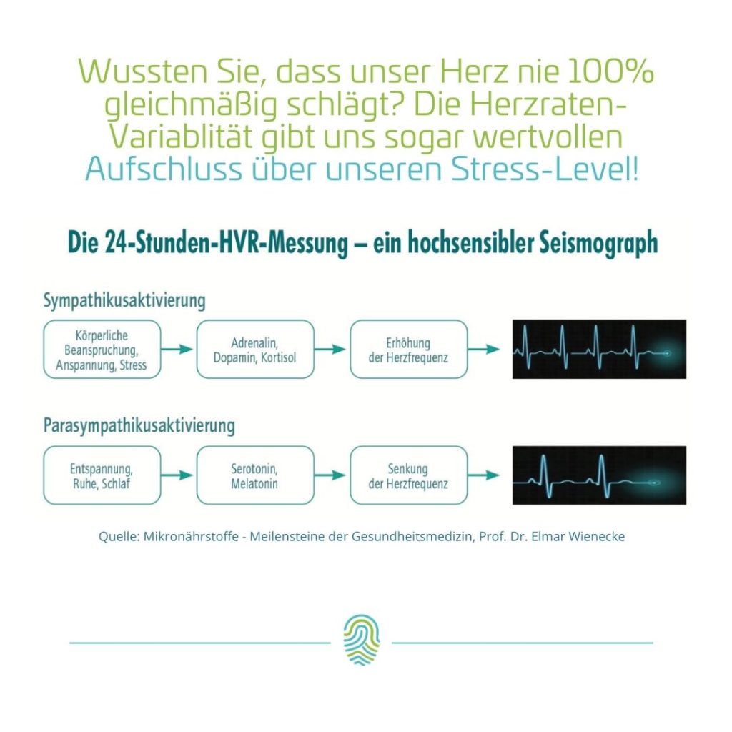Die 24- bzw. 48-Stunden-Herzratenvariabilitätsanalyse (HRV) gibt Aufschluss darüber, wie sehr sich Sympathikus und Parasympathikus im Gleichgewicht befinden. Ist dieses Gleichgewicht gestört und der Sympathikus deutlich aktiver als der Parasympathikus, befinden wir uns unter hoher Stressbelastung und geben unserem Körper zu wenig Ruhe- und Erholungs-Phasen