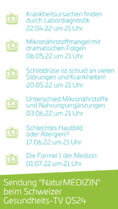 Die sechs 30-minütigen Beiträge im Format „NaturMedizin“ werden an den folgenden Sendeterminen im TV und auf der Webseite (https://qs24.tv/live-tv/) zu sehen sein:
